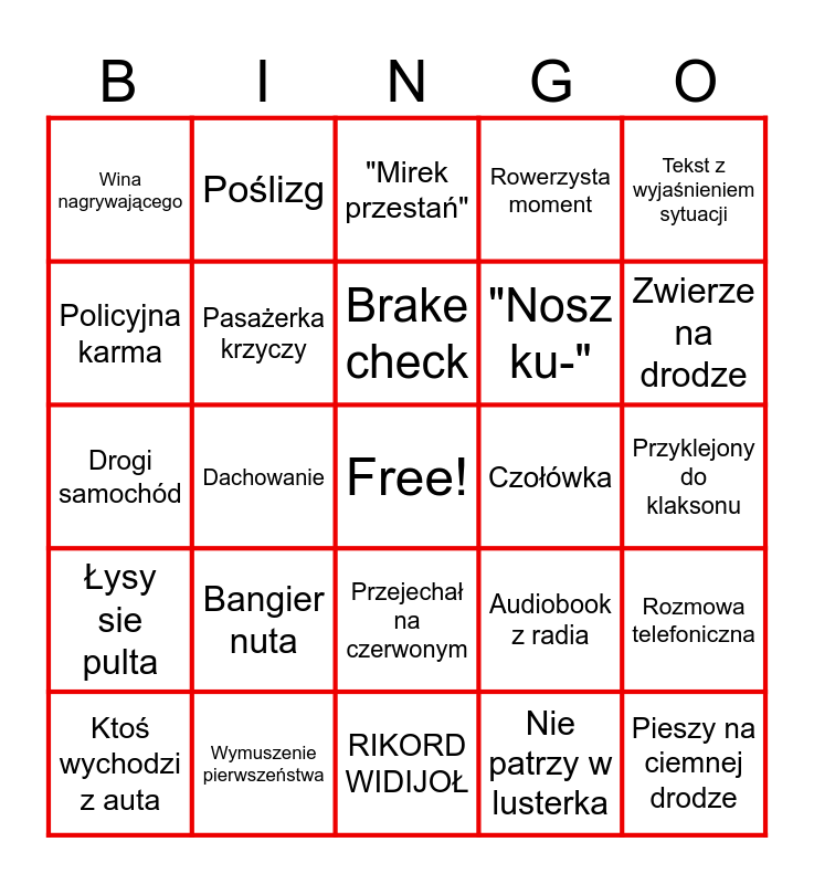 This bingo card has a free space and 24 words: Bangier nuta, Wymuszenie pierwszeństwa, Brake check, Ktoś wychodzi z auta, Tekst z wyjaśnieniem sytuacji, Wina nagrywającego, Policyjna karma, Poślizg, Czołówka, Przejechał na czerwonym, "Nosz ku-", Drogi samochód, Audiobook z radia, Rozmowa telefoniczna, Pasażerka krzyczy, Nie patrzy w lusterka, Przyklejony do klaksonu, "Mirek przestań", Zwierze na drodze, Dachowanie, Pieszy na ciemnej drodze, Łysy sie pulta, Rowerzysta moment and RIKORD WIDIJOŁ.