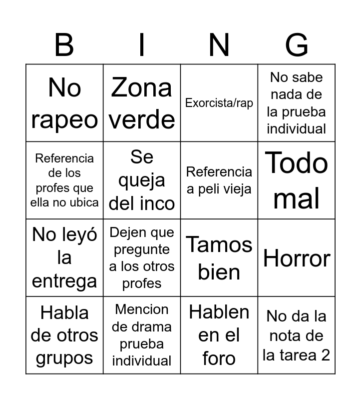 This bingo card has 16 words: Mencion de drama prueba individual, Horror, Exorcista/rap, No rapeo, No leyó la entrega, Zona verde, Tamos bien, Hablen en el foro, Referencia de los profes que ella no ubica, Se queja del inco, Habla de otros grupos, No sabe nada de la prueba individual, Dejen que pregunte a los otros profes, Todo mal, Referencia a peli vieja and No da la nota de la tarea 2.
