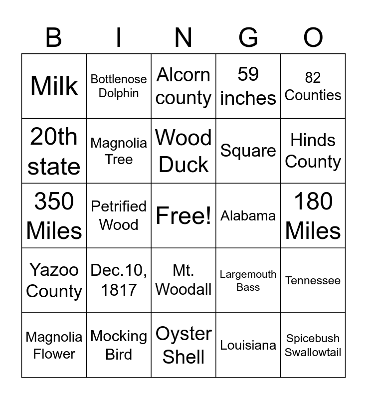 This bingo card has a free space and 29 words: Magnolia Flower, Jackson, Petrified Wood, Prehistoric Whale, Milk, Alcorn county, Magnolia Tree, Dec.10, 1817, Alabama, Mocking Bird, 180 Miles, Spicebush Swallowtail, Oyster Shell, Louisiana, Hinds County, Biloxi, Mt. Woodall, Yazoo County, 82 Counties, 350 Miles, Largemouth Bass, Issaquena County, Square, 20th state, 59 inches, Bottlenose Dolphin, Tennessee, Wood Duck and "One Mississippi".