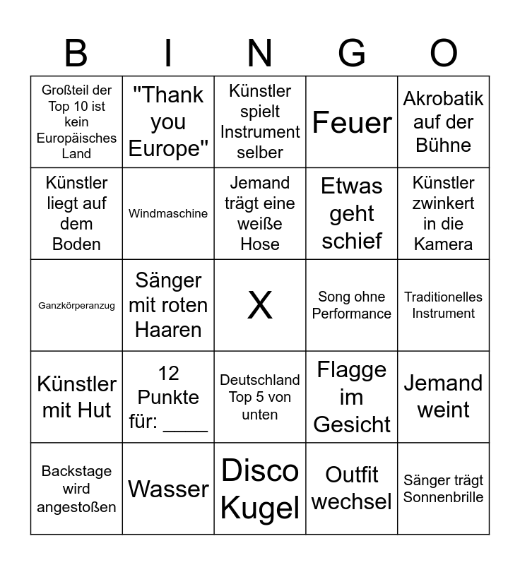 This bingo card has a free space and 24 words: 12 Punkte für: ____, Wasser, Jemand trägt eine weiße Hose, Backstage wird angestoßen, Akrobatik auf der Bühne, Großteil der Top 10 ist kein Europäisches Land, Künstler liegt auf dem Boden, ''Thank you Europe'', Song ohne Performance, Deutschland Top 5 von unten, Etwas geht schief, Ganzkörperanzug, Flagge im Gesicht, Jemand weint, Windmaschine, Outfit wechsel, Traditionelles Instrument, Künstler spielt Instrument selber, Künstler zwinkert in die Kamera, Sänger mit roten Haaren, Sänger trägt Sonnenbrille, Künstler mit Hut, Feuer and Disco Kugel.