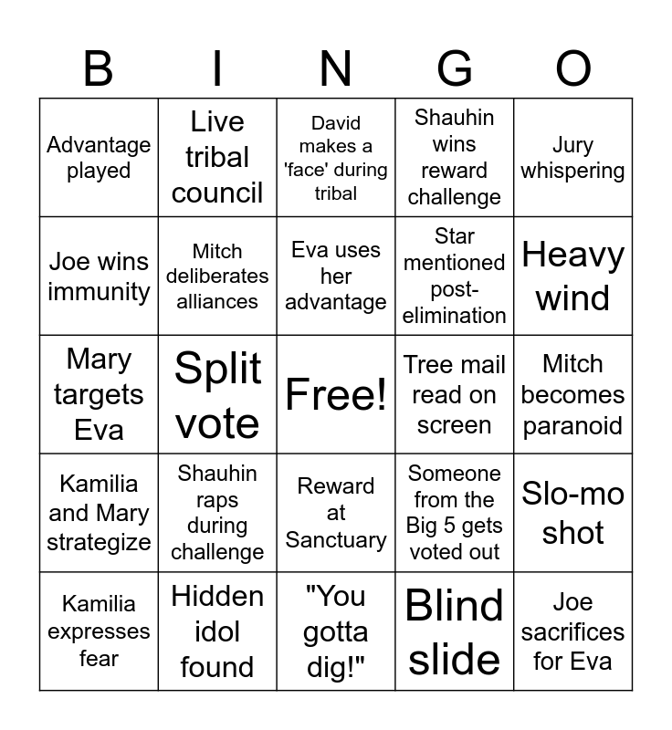 This bingo card has a free space and 24 words: Shauhin raps during challenge, Hidden idol found, Eva uses her advantage, Kamilia expresses fear, Jury whispering, Advantage played, Joe wins immunity, Live tribal council, Tree mail read on screen, Reward at Sanctuary, Star mentioned post-elimination, Mary targets Eva, Someone from the Big 5 gets voted out, Slo-mo shot, Mitch deliberates alliances, Blind slide, Mitch becomes paranoid, David makes a 'face' during tribal, Heavy wind, Split vote, Joe sacrifices for Eva, Kamilia and Mary strategize, Shauhin wins reward challenge and "You gotta dig!".