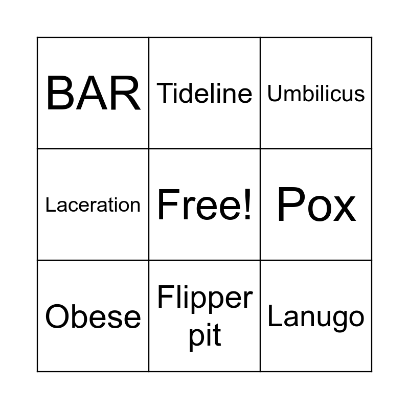 This bingo card has a free space and 8 words: Pox, Umbilicus, Tideline, Obese, BAR, Lanugo, Laceration and Flipper pit.