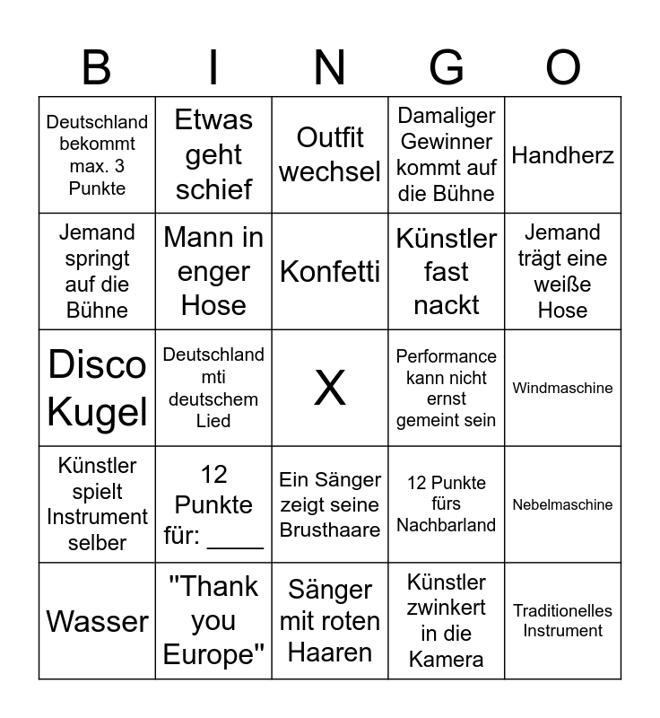 This bingo card has a free space and 24 words: 12 Punkte für: ____, ''Thank you Europe'', Konfetti, Wasser, Handherz, Deutschland bekommt max. 3 Punkte, Jemand springt auf die Bühne, Etwas geht schief, Performance kann nicht ernst gemeint sein, Ein Sänger zeigt seine Brusthaare, Künstler fast nackt, Disco Kugel, 12 Punkte fürs Nachbarland, Nebelmaschine, Mann in enger Hose, Künstler zwinkert in die Kamera, Windmaschine, Outfit wechsel, Jemand trägt eine weiße Hose, Deutschland mti deutschem Lied, Traditionelles Instrument, Künstler spielt Instrument selber, Damaliger Gewinner kommt auf die Bühne and Sänger mit roten Haaren.