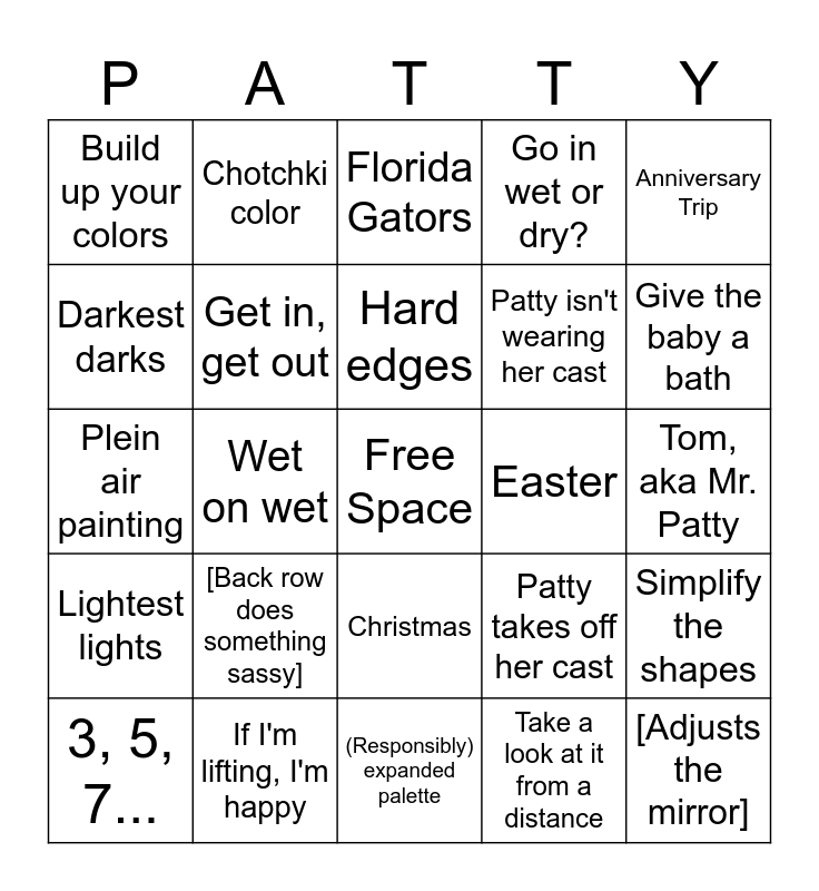 This bingo card has a free space and 37 words: Don't be a slave to the photo, "I don't know" doesn't come in a tube, White of the paper, Get in, get out, Simplify the shapes, [Back row does something sassy], Hard edges, Soften the edges, Anniversary Trip, Paint what you see, Wet on wet, Go in wet or dry?, [Adjusts the mirror], Tom, aka Mr. Patty, Darkest darks, Lightest lights, Greys, Florida Gators, Christmas, Easter, Build up your colors, Give the baby a bath, 3, 5, 7..., (Responsibly) expanded palette, Proper clearance, Take a look at it from a distance, Chotchki color, Primaries and secondaries, Lifting color, Practice player, Cold wax, If I'm lifting, I'm happy, Plein air painting, Patty is wearing her cast, Patty takes off her cast, Patty isn't wearing her cast and Painting demo.