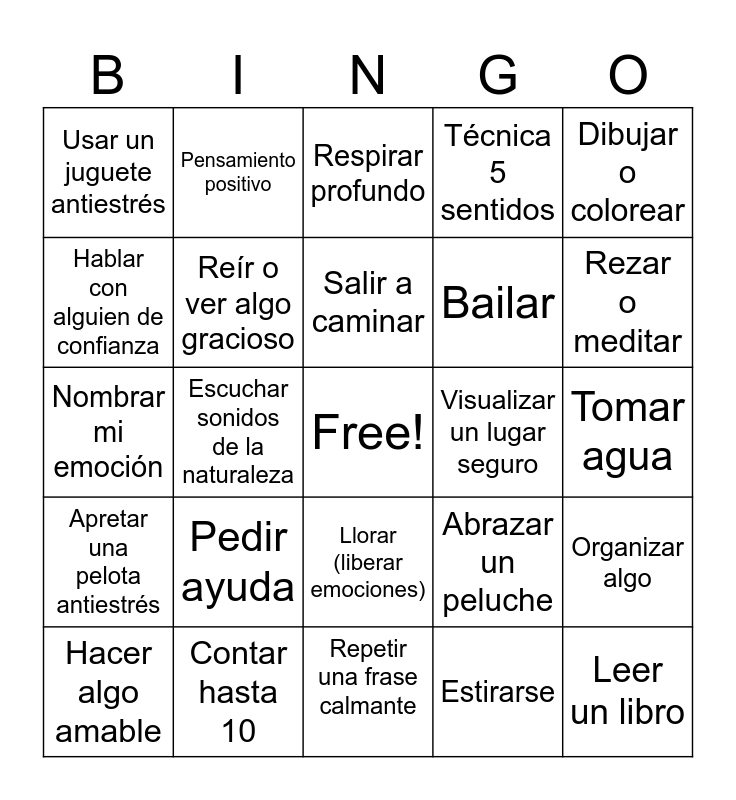 This bingo card has a free space and 24 words: Pedir ayuda, Contar hasta 10, Salir a caminar, Hacer algo amable, Dibujar o colorear, Usar un juguete antiestrés, Hablar con alguien de confianza, Pensamiento positivo, Visualizar un lugar seguro, Llorar (liberar emociones), Bailar, Nombrar mi emoción, Abrazar un peluche, Organizar algo, Reír o ver algo gracioso, Estirarse, Tomar agua, Respirar profundo, Rezar o meditar, Escuchar sonidos de la naturaleza, Leer un libro, Apretar una pelota antiestrés, Técnica 5 sentidos and Repetir una frase calmante.