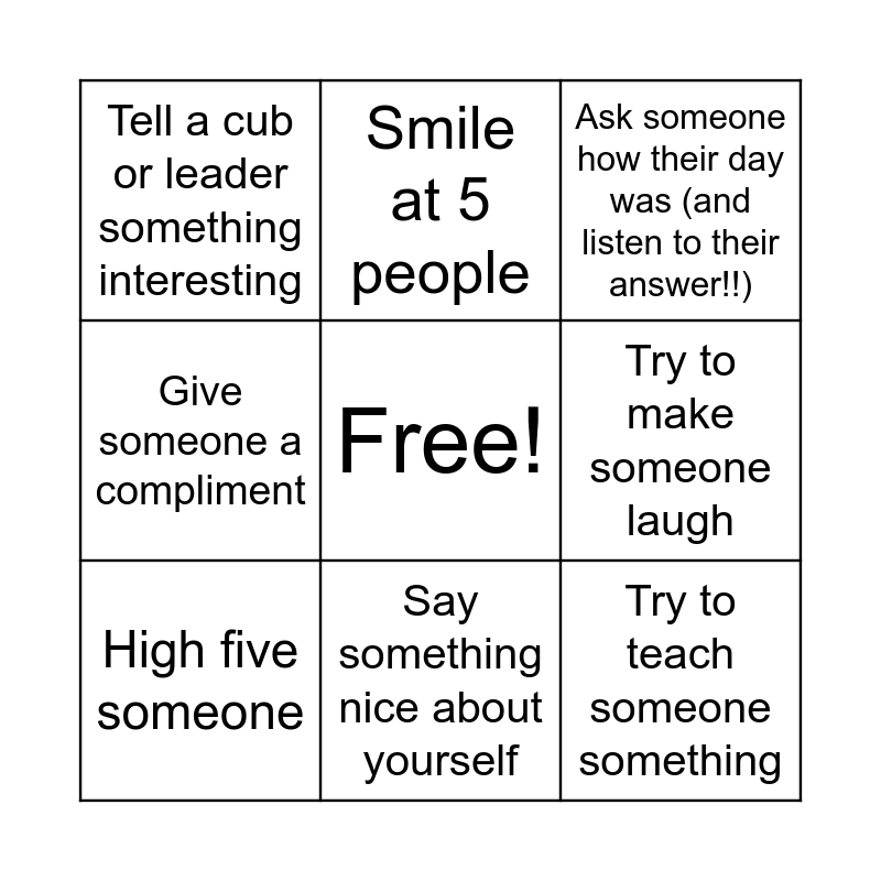This bingo card has a free space and 9 words: High five someone, Ask someone how their day was (and listen to their answer!!), Smile at 5 people, Give someone a compliment, Tell a cub or leader something interesting, Try to make someone laugh, Try to teach someone something, Talk to someone you don’t usually and Say something nice about yourself.
