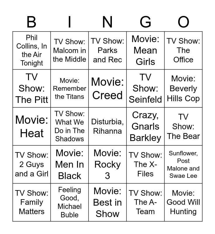 This bingo card has 78 words: Free!, Movie: The Godfather, TV Show: Parks and Rec, Movie: Tombstone, TV Show: Cheers, Raspberry Beret, Prince, You Can Call Me Al, Paul Simon, Free Fallin', Tom Petty, Fast Car, Tracy Chapman, Movie: How to Lose a Guy in 10 Days, Movie: Pretty Woman, TV Show: MacGyver, Movie: Mean Girls, Phil Collins, In the Air Tonight, TV Show: Martin, TV Show: The Pitt, TV Show: Fresh Prince of Bel-Air, Movie: Men In Black, TV Show: ER, TV Show: The Bear, TV Show:, TV Show: The Office, Movie: Heat, Movie: Creed, Movie: Remember the Titans, Movie: Jaws, Movie: Amadeus, Dreams, Fleetwood Mac, Movie: Step Brothers, Movie: Love Actually, Movie: Beverly Hills Cop, Neon Moon, Brooks and Dunn, Movie: Best in Show, Movie: Good Will Hunting, TV Show: Family Matters, Crazy, Gnarls Barkley, TV Show: Daisy Jones and the Six, Movie: Almost Famous, All For You, Janet Jackson, Disturbia, Rihanna, Girl From the North Country, Bob Dylan and Jonny Cash, Rehab, Amy Winehouse, Don’t Bring Me Down, Electric Light Orchestra, I Want It That Way, Backstreet Boys, Say My Name, Destiny's Child, TV Show: Malcom in the Middle, TV Show: Breaking Bad, We Like to Party, Vengaboys, Mambo Number 5, Lou Bega, TV Show: M*A*S*H, Sunflower, Post Malone and Swae Lee, TV Show: What We Do in The Shadows, TV Show: The X-Files, TV Show: Below Deck, Movie: Vertigo, Movie Casablanca, TV Show: Saved by the Bell, Movie: Star Wars Empire Strikes Back, The Killers, Mr. Brightside, Movie: Rocky 3, TV Show: Seinfeld, TV Show; Friends, Movie: Slap Shot, Movie: Star Trek Wrath of Khan, TV Show: Deadwood, Sweet Caroline, Neil Diamond, Sledge Hammer, Peter Gabriel, TV Show: Hanging with Mr Cooper, TV Show: 2 Guys and a Girl, Feeling Good, Michael Buble, Take Me Home Country Roads, John Denver, Movie: The Social Network, Movie: The Prestige, TV Show: Perfect Strangers, TV Show: The A-Team, Movie: Money Ball, Movie: Dirty Dancing and Movie: Ghost.