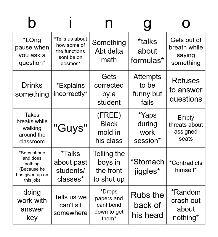 This bingo card has a free space and 29 words: doing work with answer key, *Getts simple equation wrong*, "Guys", *Umm*, *LOng pause when you ask a question*, Something Abt delta math, *Explains incorrectly*, *Talks about past students/ classes*, *Yaps during work session*, Tells us we can't sit somewhere, Empty threats about assigned seats, *Random crash out about nothing*, *Drops papers and cant bend down to get them*, Rubs the back of his head, Refuses to answer questions, Says something to laith about online school, Telling the boys in the front to shut up, *Sees phone and does nothing (Because he has given up on this job), Gets out of breath while saying something, Takes breaks while walking around the classroom, *Stomach jiggles*, *Talks about sports*, Attempts to be funny but fails, Drinks something, *talks about formulas*, *Tells us about how some of the functions sont be on desmos*, *Contradicts himself*, Gets corrected by a student and talks about desmos.