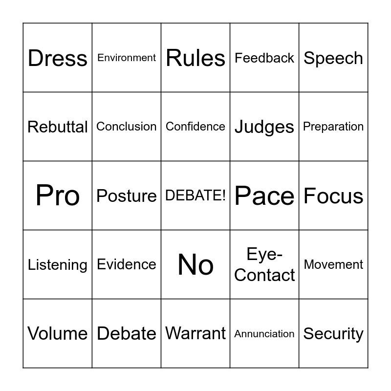 This bingo card has a free space and 51 words: Economy, Security, Claim, Warrant, Evidence, Example, Environment, SIgnificance, Rebuttal, Financial, Conclusion, Feedback, Movement, Eye-Contact, Hand Gesture, Facial Expressions, Confidence, Pace, Intonation, Speech, Posture, Annunciation, Dress, Judges, Game, Courage, Preparation, Change, Volume, Rules, Citation, Social Values, Safety, Resolved, Vs, Debate, Questions, Clarity, Emphasis, Communication, Focus, Listening, Audience, Coaching, Evaluation, Affirmation, Pro, Con, Yes, No and Support.