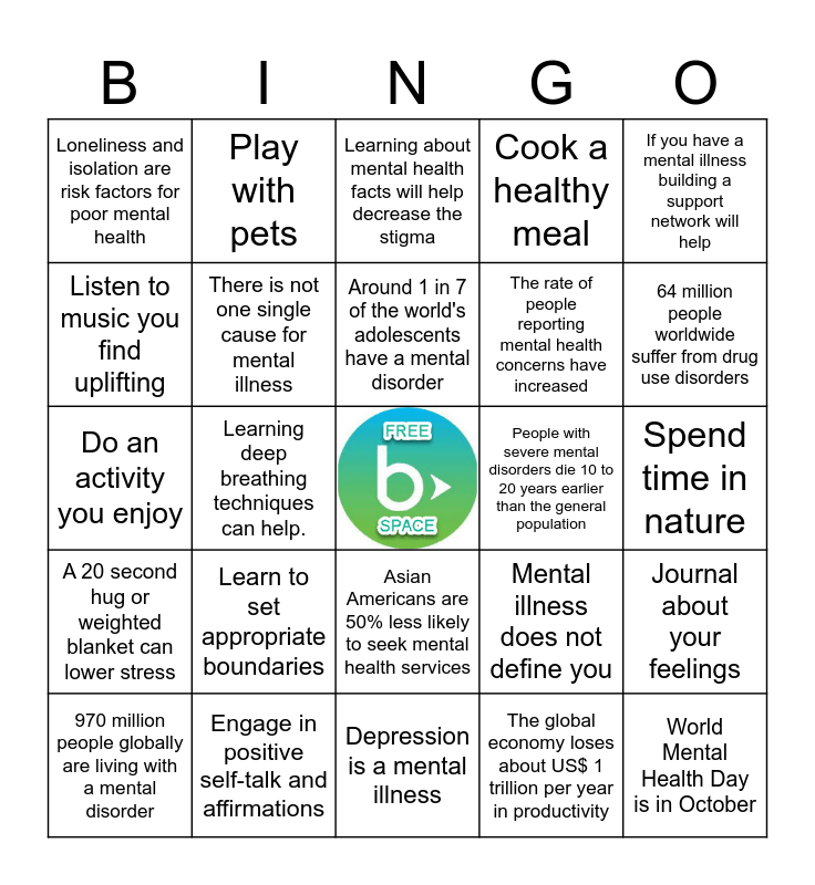This bingo card has a free space and 55 words: 1 in 5 adults and 1 in 6 youth experience mental illness each year, 970 million people globally are living with a mental disorder, Anyone can develop a mental illness, Loneliness and isolation are risk factors for poor mental health, Depression is a mental illness, Text "home" to 741741 for the crisis line, There is not one single cause for mental illness, Mental Health includes our emotional, psychological and social well being, The rate of people reporting mental health concerns have increased, ADHD is a mental health condition, Cook a healthy meal, OCD is a mental health condition, Some people take a prescribed medication as a treatment option, Therapy is a great treatment option, Unfollow people who bring you down, Chronic health conditions, such as cancer or diabetes contribute to mental illness, If you have a mental illness building a support network will help, Learning deep breathing techniques can help., Mental, neurological and substance use disorders make up 10% of the global burden of disease, World Mental Health Day is in October, People with severe mental disorders die 10 to 20 years earlier than the general population, Mental health awareness month in May started in 1949 in the USA, Mental illness does not define you, Learning about mental health facts will help decrease the stigma, Mental health is an important part of your health and well-being, Around 1 in 7 of the world's adolescents have a mental disorder, The global economy loses about US$ 1 trillion per year in productivity, 1 in 9 people in areas affected by conflict have a moderate or severe mental disorder, Spend time in nature, Journal about your feelings, Practice mindfulness or meditation, If possible, move your body in some way, Use your wellness days if you need them, Drug addiction is a mental illness, Listen to music you find uplifting, Do an activity you enjoy, Take a shower or bath, A 20 second hug or weighted blanket can lower stress, Phone or text a friend, Make some kind of art or doodle, Play with pets, Clear some clutter, Join a support group, Go somewhere you can hear birds sing, Learn to set appropriate boundaries, Engage in positive self-talk and affirmations, Watch something that makes you laugh, Schizophrenia, bipolar disorder, and major depressive disorder, Serotonin is in the gut, 64 million people worldwide suffer from drug use disorders, Postpartum depression is experienced by 1 in 9 new mothers, Webinar: Understanding Anxiety will be available in DevelopU, Blackbaud Global Wellbeing Support Center, Asian Americans are 50% less likely to seek mental health services and 80% of Asian Americans with mental health disorders do not receive treatment.