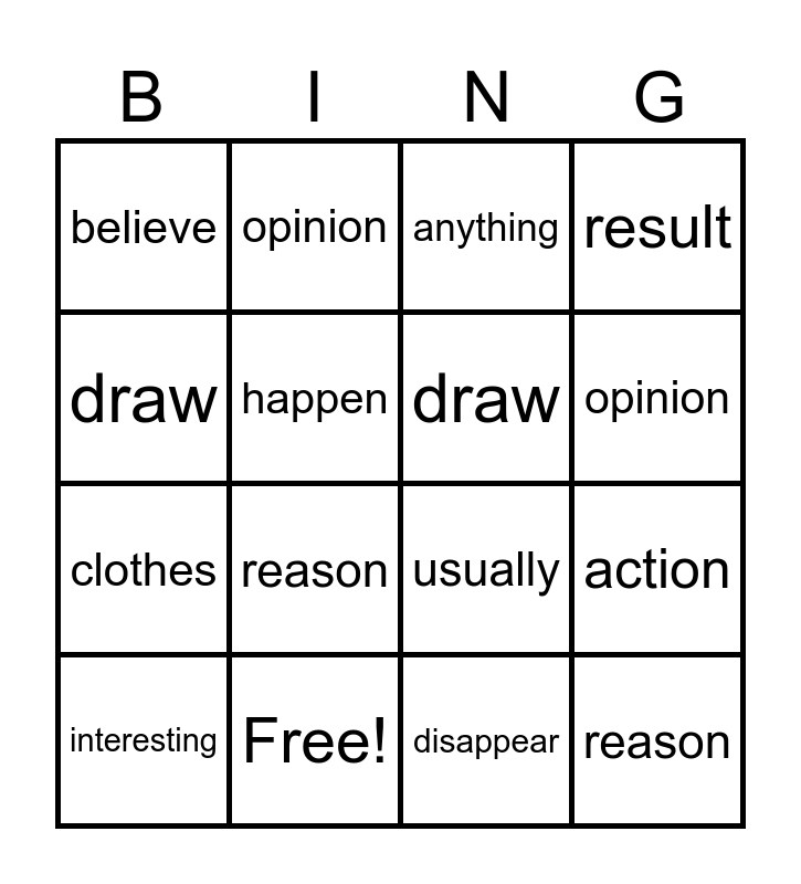 This bingo card has 16 words: Free!, action, anything, believe, clothes, opinion, usually, disappear, draw, happen, interesting, result, reason, opinion, draw and reason.