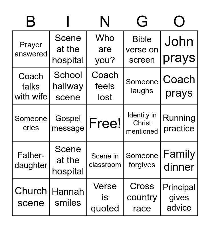 This bingo card has a free space and 24 words: Scene at the hospital, Hannah smiles, Coach feels lost, Church scene, John prays, Prayer answered, Coach talks with wife, Scene at the hospital, Identity in Christ mentioned, Scene in classroom, Someone laughs, Someone cries, Someone forgives, Family dinner, School hallway scene, Cross country race, Running practice, Who are you?, Coach prays, Gospel message, Principal gives advice, Father-daughter, Bible verse on screen and Verse is quoted.