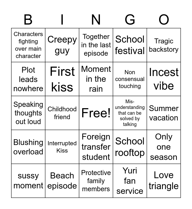 This bingo card has a free space and 24 words: Interrupted Kiss, Beach episode, Moment in the rain, sussy moment, Tragic backstory, Characters fighting over main character, Plot leads nowhere, Creepy guy, Mis-understanding that can be solved by talking, Foreign transfer student, Non consensual touching, Speaking thoughts out loud, School rooftop, Only one season, First kiss, Yuri fan service, Summer vacation, Together in the last episode, Incest vibe, Childhood friend, Love triangle, Blushing overload, School festival and Protective family members.