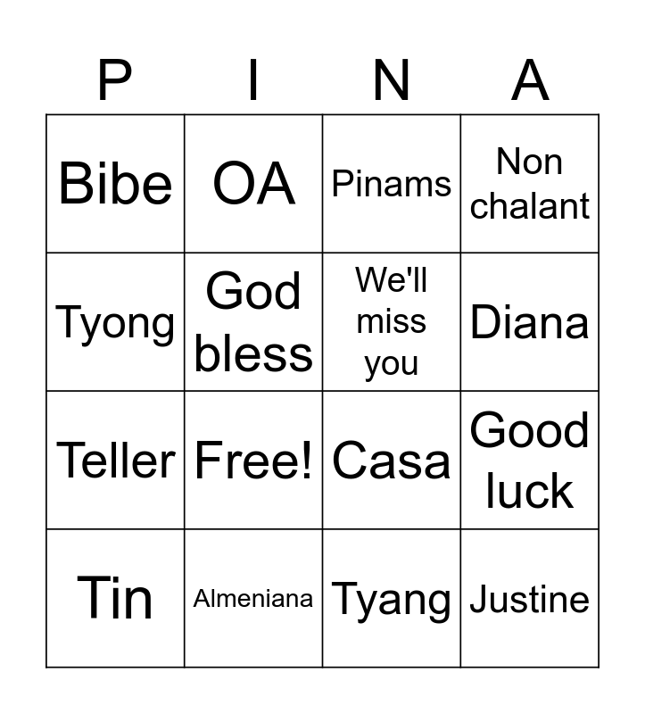 This bingo card has 18 words: Free!, Justine, Pinams, Bibe, Casa, Non chalant, Tin, OA, Diana, Teller, Tyang, Tyong, Good luck, God bless, We'll miss you, LBP, Almeniana and Mazon.