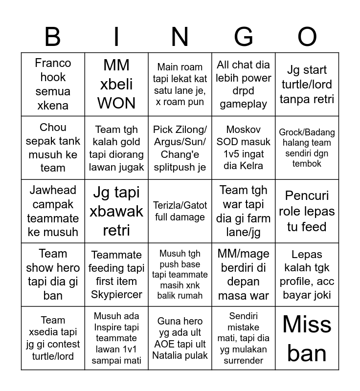 This bingo card has a free space and 24 words: Teammate feeding tapi first item Skypiercer, Musuh ada Inspire tapi teammate lawan 1v1 sampai mati, Pick Zilong/ Argus/Sun/ Chang'e splitpush je, Team xsedia tapi jg gi contest turtle/lord, Jg start turtle/lord tanpa retri, Franco hook semua xkena, Chou sepak tank musuh ke team, MM xbeli WON, Team tgh war tapi dia gi farm lane/jg, Musuh tgh push base tapi teammate masih xnk balik rumah, Moskov SOD masuk 1v5 ingat dia Kelra, Jawhead campak teammate ke musuh, MM/mage berdiri di depan masa war, Lepas kalah tgk profile, acc bayar joki, Team tgh kalah gold tapi diorang lawan jugak, Sendiri mistake mati, tapi dia yg mulakan surrender, Pencuri role lepas tu feed, Main roam tapi lekat kat satu lane je, x roam pun, Grock/Badang halang team sendiri dgn tembok, Jg tapi xbawak retri, Miss ban, Team show hero tapi dia gi ban, All chat dia lebih power drpd gameplay and Guna hero yg ada ult AOE tapi ult Natalia pulak.