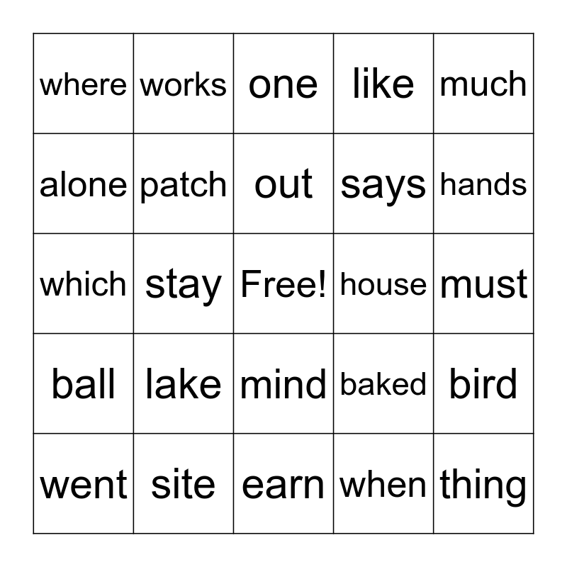 This bingo card has a free space and 24 words: lake, site, out, went, much, where, alone, works, house, mind, says, which, baked, bird, patch, when, must, one, hands, stay, thing, ball, like and earn.