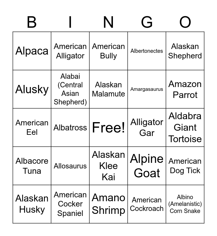 This bingo card has a free space and 39 words: Akbash, Akita, Akita Shepherd, Alabai (Central Asian Shepherd), Alaskan Husky, Alaskan Klee Kai, Alaskan Malamute, Alaskan Pollock, Alaskan Shepherd, Albacore Tuna, Albatross, Albertonectes, Albino (Amelanistic) Corn Snake, Aldabra Giant Tortoise, Alligator Gar, Allosaurus, Allosaurus, Alpaca, Alpine Dachsbracke, Alpine Goat, Alusky, Amano Shrimp, Amargasaurus, Amazon Parrot, Amazon River Dolphin (Pink Dolphin), Amazon Tree Boa, Amazonian Royal Flycatcher, Amberjack, Ambrosia Beetle, American Alligator, American Alsatian, American Bulldog, American Bully, American Cocker Spaniel, American Cockroach, American Coonhound, American Dog Tick, American Eel and American Eskimo Dog.