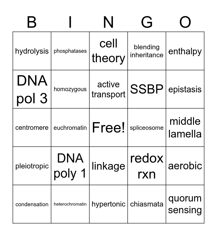 This bingo card has a free space and 27 words: redox rxn, benign tumor cell, SSBP, hypertonic, DNA pol 3, cell theory, phosphatases, pleiotropic, spliceosome, aerobic, centromere, blending inheritance, condensation, heterochromatin, epistasis, enzyme, homozygous, active transport, DNA poly 1, hydrolysis, middle lamella, chiasmata, euchromatin, quorum sensing, linkage, enthalpy and missense.