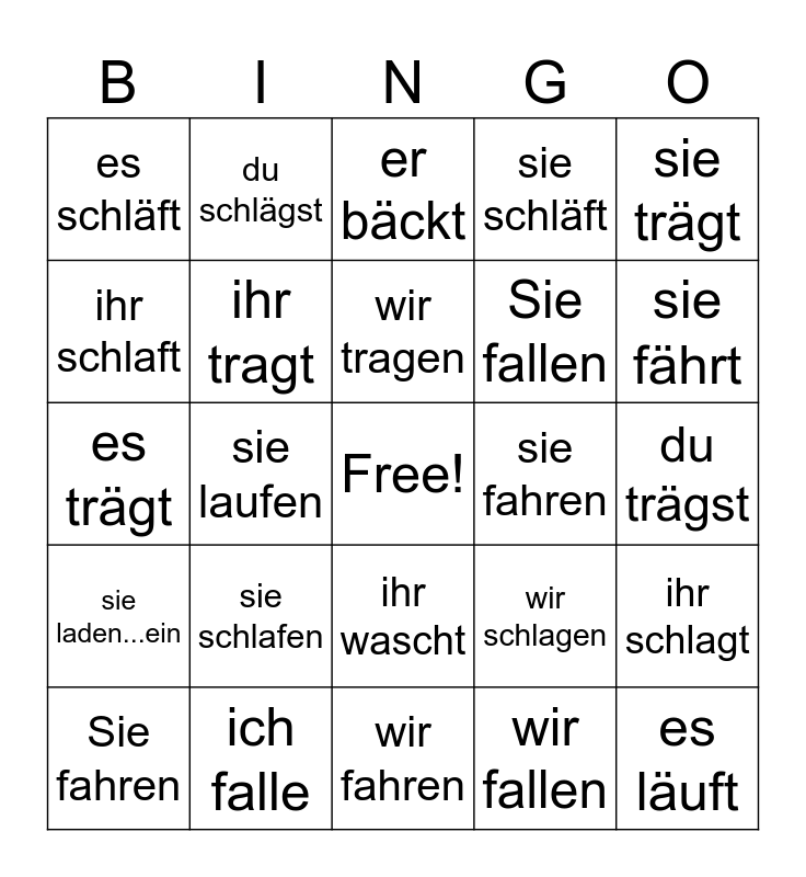 This bingo card has a free space and 81 words: ich backe, du bäckst, er bäckt, sie bäckt, es bäckt, wir backen, ihr backt, Sie backen, sie backen, ich schlafe, du schläfst, er schläft, sie schläft, es schläft, wir schlafen, ihr schlaft, Sie schlafen, sie schlafen, ich trage, du trägst, er trägt, sie trägt, es trägt, wir tragen, ihr tragt, Sie tragen, sie tragen, ich fahre, du fährst, er fährt, sie fährt, es fährt, wir fahren, ihr fahrt, Sie fahren, sie fahren, ich laufe, du läufst, er läuft, sie läuft, es läuft, wir laufen, ihr lauft, Sie laufen, sie laufen, ich schlage, du schlägst, er schlägt, sie schlägt, es schlägt, wir schlagen, ihr schlagt, Sie schlagen, sie schlagen, ich wasche, du wäschst, er wäscht, sie wäscht, es wäscht, wir waschen, ihr wascht, Sie waschen, sie waschen, ich lade...ein, du lädst...ein, er lädt...ein, sie lädt...ein, es lädt...ein, wir laden...ein, ihr ladet...ein, Sie laden...ein, sie laden...ein, ich falle, du fällst, er fällt, sie fällt, es fällt, wir fallen, ihr fallt, Sie fallen and sie fallen.