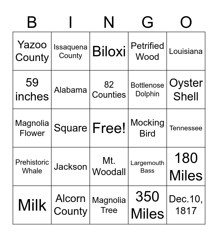 This bingo card has a free space and 29 words: Milk, "One Mississippi", Square, Wood Duck, Yazoo County, Biloxi, Alabama, Jackson, Mocking Bird, Alcorn County, Tennessee, Dec.10, 1817, Magnolia Tree, 350 Miles, Oyster Shell, Spicebush Swallowtail, Mt. Woodall, Prehistoric Whale, Louisiana, Magnolia Flower, Largemouth Bass, 20th State, Bottlenose Dolphin, 59 inches, Petrified Wood, Issaquena County, 180 Miles, 82 Counties and Hinds County.