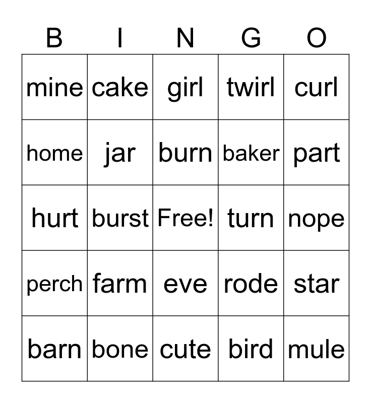 This bingo card has a free space and 24 words: farm, bone, burn, barn, curl, mine, home, cake, turn, eve, baker, hurt, rode, star, jar, bird, nope, girl, part, burst, mule, perch, twirl and cute.
