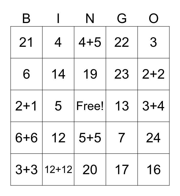 This bingo card has a free space and 47 words: 10, 16, 18, 20, 12, 14, 4, 2, 6, 8, 14, 22, 24, 7, 11, 15, 19, 13, 9, 3, 5, 17, 21, 23, 1+1, 2+2, 3+3, 4+4, 5+5, 6+6, 7+7, 8+8, 9+9, 10+10, 11+11, 12+12, 3+4, 6+5, 8+7, 9+10, 6+7, 4+5, 2+1, 3+2, 8+9, 11+10 and 12+11.