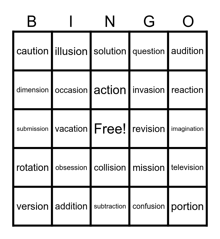 This bingo card has a free space and 26 words: collision, confusion, action, addition, audition, caution, dimension, illusion, imagination, mission, invasion, submission, television, version, vacation, option, question, rotation, solution, portion, reaction, subtraction, revision, obsession, occasion and passion.