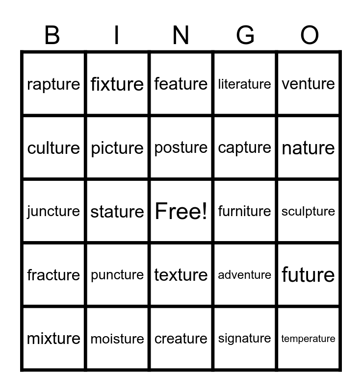 This bingo card has a free space and 27 words: adventure, agriculture, capture, creature, culture, feature, fixture, fracture, furniture, future, juncture, literature, mixture, moisture, nature, pasture, picture, posture, puncture, rapture, sculpture, signature, stature, temperature, texture, venture and vulture.