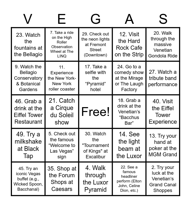 This bingo card has a free space and 50 words: 1. Take a photo in front of the Bellagio Fountains, 2. Try your luck at the Venetian’s Grand Canal Shoppes, 3. Visit the Mirage Volcano Show, 4. Walk through the Luxor Pyramid, 5. Check out the famous “Welcome to Las Vegas” sign, 6. Explore the Paris Hotel & its replica Eiffel Tower, 7. Take a ride on the High Roller Observation Wheel at The LINQ, 8. Play a slot machine at Caesars Palace, 9. Watch the Bellagio Conservatory & Botanical Gardens, 10. See the Flamingo Wildlife Habitat, 11. Experience the New York-New York roller coaster, 12. Visit the Hard Rock Cafe on the Strip, 13. Try your hand at poker at the MGM Grand, 14. See the light beam at the Luxor, 15. Explore the Wynn & Encore’s upscale shopping, 16. Go to the Planet Hollywood Miracle Mile Shops, 17. Take a selfie with the “Pyramid” hotel, 18. Grab a drink at the Venetian’s “Bacchus Bar”, 19. Find the secret speakeasy at The Vault (The Cosmopolitan), 20. Walk through the massive Venetian Gondola Ride, 21. Catch a Cirque du Soleil show, 22. See a famous headliner perform (Elton John, Celine Dion, etc.), 23. Watch the fountains at the Bellagio, 24. Go to a comedy show at the Mirage or The Laugh Factory, 25. Attend a magic show (e.g., David Copperfield, Penn & Teller), 26. Experience the Blue Man Group performance, 27. Watch a tribute band performance, 28. Take in a burlesque show, 29. Check out the neon lights at Fremont Street (Downtown), 30. Watch the "Tournament of Kings" at Excalibur, 31. Ride the Zip Line at Slotzilla (Fremont Street), 32. Visit the Neon Museum & Neon Boneyard, 33. Go to the "Chandelier Bar" at The Cosmopolitan, 34. Take a selfie in front of the famous "Welcome to Fabulous Las Vegas" sign, 35. Shop at the Forum Shops at Caesars, 36. Walk through the Mirage’s Secret Garden & Dolphin Habitat, 37. Visit the LINQ Promenade for unique shops and restaurants, 38. Take a gondola ride at The Venetian, 39. Check out the Shark Reef Aquarium at Mandalay Bay, 40. Visit the Eiffel Tower Experience, 41. Go to the Las Vegas Natural History Museum, 42. Take a picture with the giant chocolate fountain at Bellagio, 43. See the Strip from the top of the Stratosphere Tower, 44. Take a ride on the Big Apple Coaster at New York-New York, 45. Try an iconic Vegas buffet (e.g., Wicked Spoon, Bacchanal), 46. Grab a drink at the Eiffel Tower Restaurant, 47. Eat a fancy dinner at a celebrity chef restaurant (e.g., Gordon Ramsay, Wolfgang Puck), 48. Have a slice at the famous Secret Pizza, 49. Try a milkshake at Black Tap and 50. Enjoy a fancy cocktail at The Chandelier bar in The Cosmopolitan.