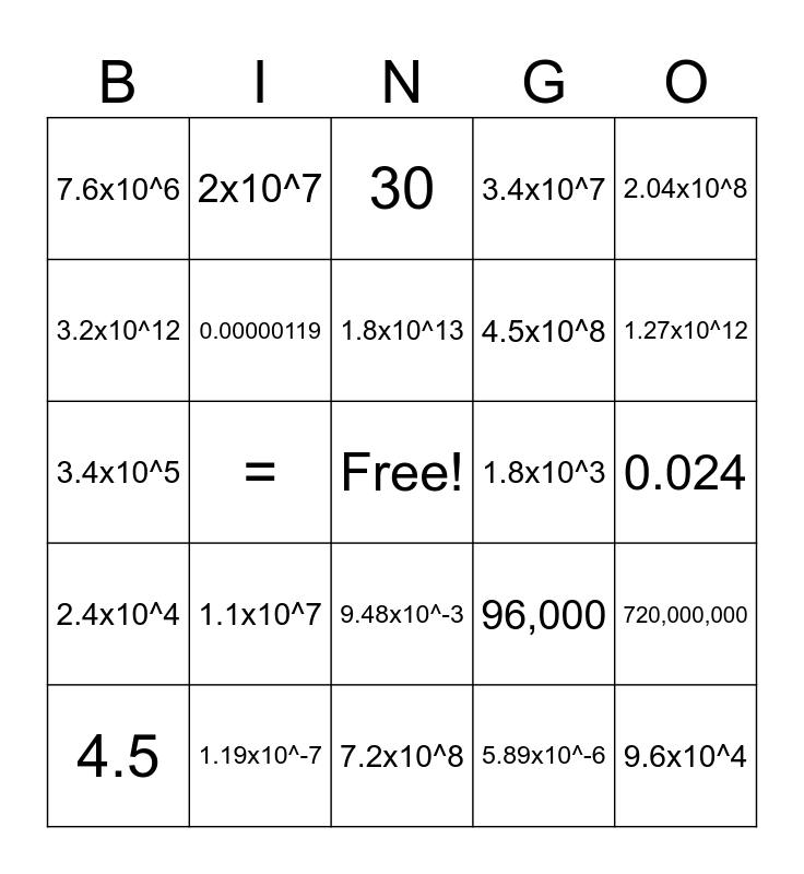 This bingo card has a free space and 25 words: 1.1x10^7, 7.2x10^8, 1.8x10^13, 4.5, 2.04x10^8, 7.6x10^6, 3.2x10^12, 2x10^7, 1.8x10^3, 9.48x10^-3, 4.5x10^8, 3.4x10^5, 96,000, 720,000,000, 0.00000119, 0.00948, 0.024, 30, 1.27x10^12, =, 9.6x10^4, 1.19x10^-7, 2.4x10^4, 3.4x10^7 and 5.89x10^-6.