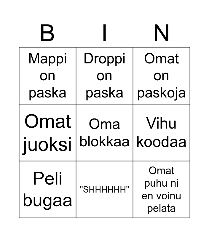 This bingo card has a free space and 8 words: Vihu koodaa, Omat on paskoja, Droppi on paska, Peli bugaa, Mappi on paska, Omat puhu ni en voinu pelata, Omat juoksi and "SHHHHHH".