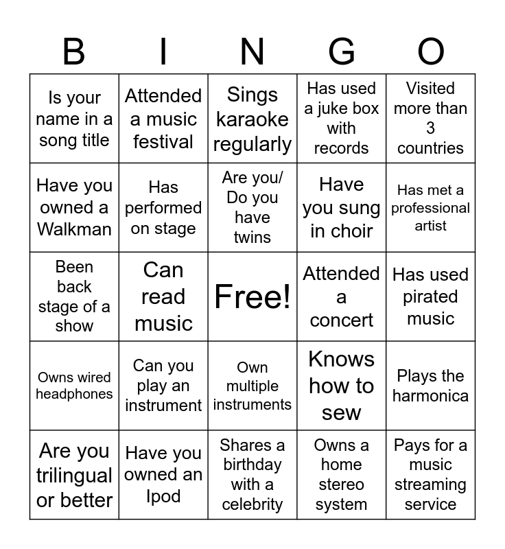 This bingo card has a free space and 24 words: Can you play an instrument, Have you owned an Ipod, Are you/ Do you have twins, Are you trilingual or better, Visited more than 3 countries, Is your name in a song title, Have you owned a Walkman, Attended a music festival, Attended a concert, Own multiple instruments, Have you sung in choir, Been back stage of a show, Knows how to sew, Plays the harmonica, Has performed on stage, Owns a home stereo system, Has used pirated music, Sings karaoke regularly, Has met a professional artist, Can read music, Pays for a music streaming service, Owns wired headphones, Has used a juke box with records and Shares a birthday with a celebrity.