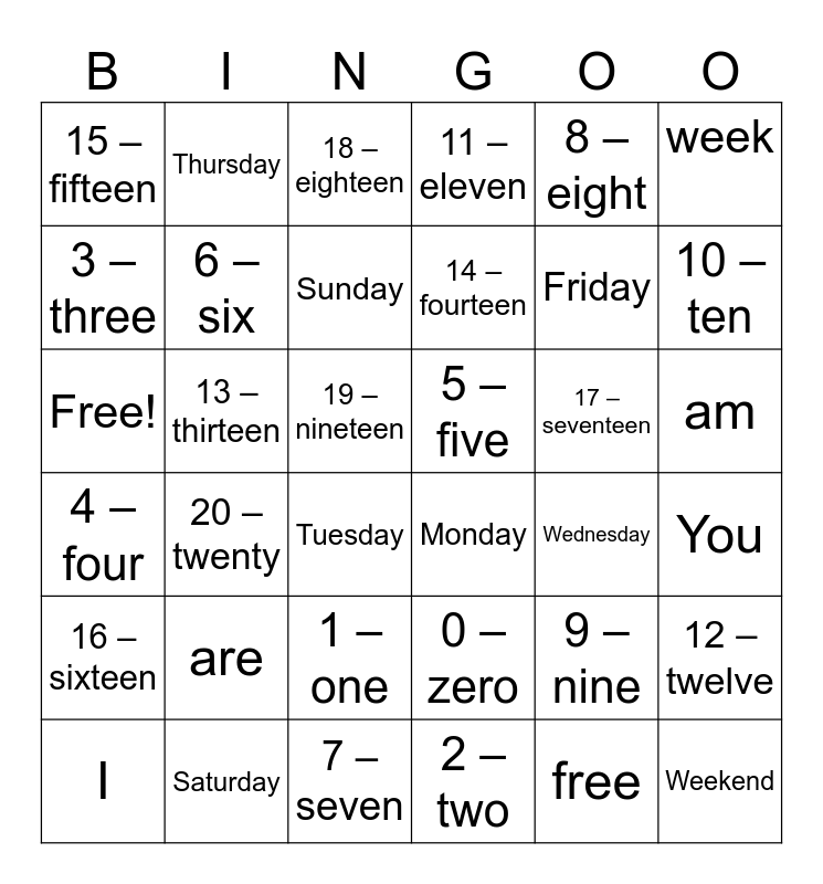 This bingo card has 36 words: 0 – zero, 1 – one, 2 – two, 3 – three, 4 – four, 5 – five, 6 – six, 7 – seven, 8 – eight, 9 – nine, 10 – ten, 11 – eleven, 12 – twelve, 13 – thirteen, 14 – fourteen, 15 – fifteen, 16 – sixteen, 17 – seventeen, Free!, 18 – eighteen, 19 – nineteen, 20 – twenty, Monday, Tuesday, Wednesday, Thursday, Friday, Saturday, Sunday, week, Weekend, I, You, am, are and free.