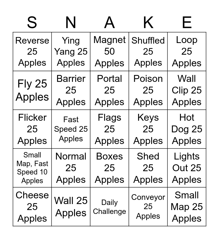 This bingo card has a free space and 24 words: Normal 25 Apples, Wall 25 Apples, Portal 25 Apples, Cheese 25 Apples, Loop 25 Apples, Reverse 25 Apples, Fly 25 Apples, Ying Yang 25 Apples, Keys 25 Apples, Boxes 25 Apples, Poison 25 Apples, Flicker 25 Apples, Shed 25 Apples, Lights Out 25 Apples, Barrier 25 Apples, Conveyor 25 Apples, Hot Dog 25 Apples, Magnet 50 Apples, Wall Clip 25 Apples, Fast Speed 25 Apples, Small Map 25 Apples, Small Map, Fast Speed 10 Apples, Shuffled 25 Apples and Daily Challenge.