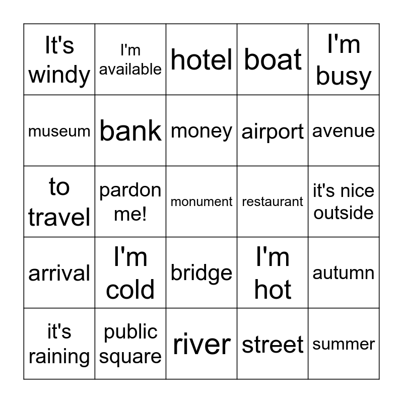 This bingo card has a free space and 34 words: statue, street, townhall, train station, arrival, bank, I'm busy, it's raining, I'm available, cathedral, money, hotel, neighborhood, car, restaurant, avenue, public square, to travel, I'm cold, I'm hot, bridge, post office, It's windy, it's nice outside, river, summer, boat, good idea!, airport, museum, It's chilly, pardon me!, autumn and tired.