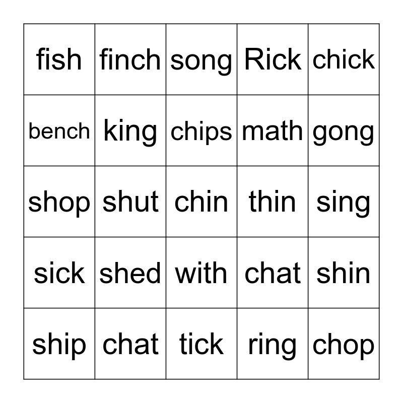 This bingo card has a free space and 24 words: shed, chat, chips, ship, chick, fish, bench, finch, thin, with, math, shop, chat, shin, king, ring, sing, song, gong, shut, chop, sick, Rick and tick.