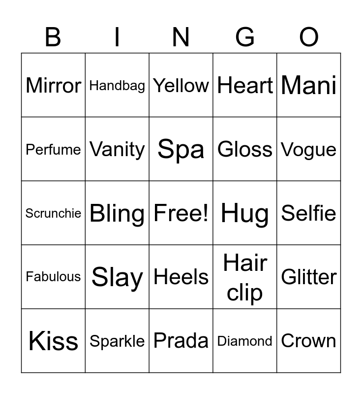 This bingo card has a free space and 67 words: Lipstick, Bow, Blush, Glitter, Pearls, Nail polish, Handbag, Mascara, Spa, Barbie, Heels, Lashes, Selfie, Mani, Pedi, Perfume, Bling, Mirror, Pink, Gloss, Slay, Fabulous, Heart, Diamond, Fluffy, Tulle, Ribbon, Girly, Vogue, Cute, Crown, Chic, Glam, Glow, Silk, Kiss, Tiara, Hair clip, Scrunchie, Pajamas, Slippers, Vanity, Hug, Sassy, Lip gloss, Love, Bubbles, Sparkle, Noor, White, Yellow, Fashion, Chanel, Hermès, Dior, Prada, Gucci, Fenty, YSL, Versace, Glossier, Valentino, Olympics, Poles, Paris, Disney and The Met.