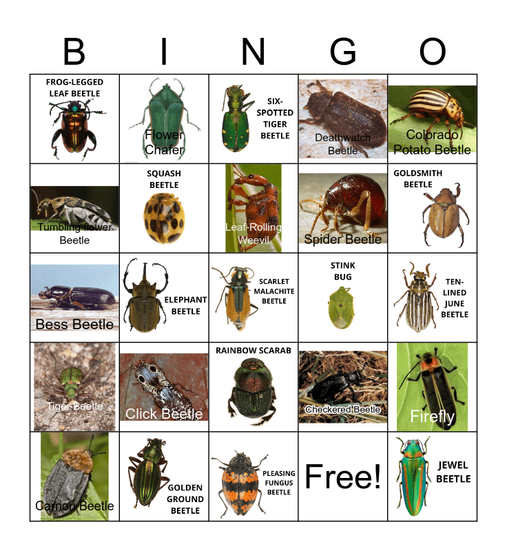 This bingo card has 29 images and 15 words: Free!, Checkered Beetle, Tiger Beetle, Click Beetle, Colorado Potato Beetle, Bess Beetle, Soldier Beetle, Flower Chafer, Spider Beetle, Tumbling flower Beetle, Deathwatch Beetle, Firefly, Carrion Beetle, Leaf-Rolling Weevil and Dung Beetle.