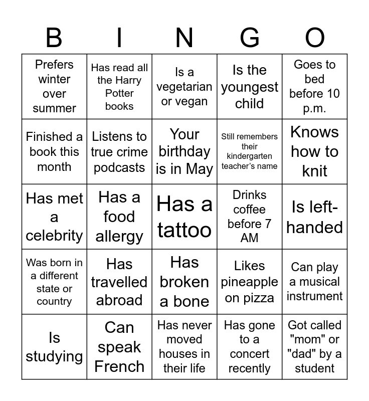 This bingo card has a free space and 24 words: Has travelled abroad, Can speak French, Your birthday is in May, Is studying, Goes to bed before 10 p.m., Prefers winter over summer, Finished a book this month, Has read all the Harry Potter books, Drinks coffee before 7 AM, Has broken a bone, Still remembers their kindergarten teacher’s name, Has met a celebrity, Likes pineapple on pizza, Can play a musical instrument, Listens to true crime podcasts, Has gone to a concert recently, Is left-handed, Is a vegetarian or vegan, Knows how to knit, Has a food allergy, Got called "mom" or "dad" by a student, Was born in a different state or country, Is the youngest child and Has never moved houses in their life.