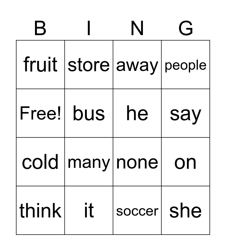 This bingo card has 16 words: it, on, away, fruit, cold, store, none, soccer, Free!, bus, think, people, many, say, he and she.