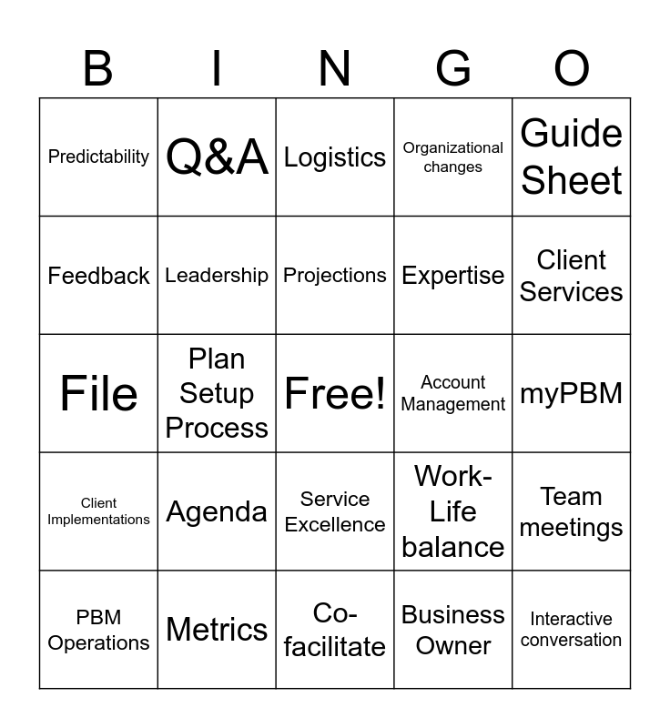 This bingo card has a free space and 47 words: Roundtable, Interactive conversation, Facilitate, Co-facilitate, Agenda, Direct Reports, Q&A, Presentations, Feedback, Vision, Leadership, Organizational changes, Team meetings, Work-Life balance, GPS, Tools, Projections, Account Management, PCS Testing, Guide Sheet, Plan Setup Process, Business Owner, Predictability, Expertise, Challenges, Client Services, PBM Operations, Implementation, Service Excellence, Client Implementations, Value Transformation, Overview, Personal Journey Map, Engagement Results, Workstream Update, Metrics, myPBM, Roadmap, Communication Enhancements, Recognitions, Survey, Logistics, File, Onsite, Hosts, Requirements and Status.