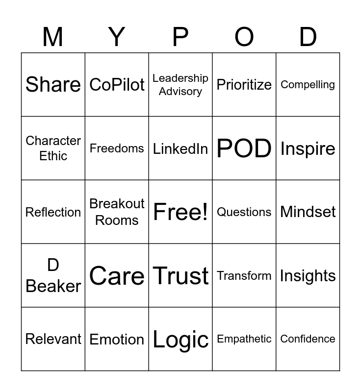 This bingo card has a free space and 34 words: Curious, Empathetic, MYJourney, Patience, D Beaker, Freedoms, Compelling, Relevant, CoPilot, Strategic, LinkedIn, Leadership Advisory, Connection, CRIT, Questions, Inspire, Emotion, Reflection, Care, Transform, Trust, Vulnerability, Share, Mindset, Logic, Confidence, Prioritize, Communication, POD, Character Ethic, Dreams, Breakout Rooms, Insights and Success.