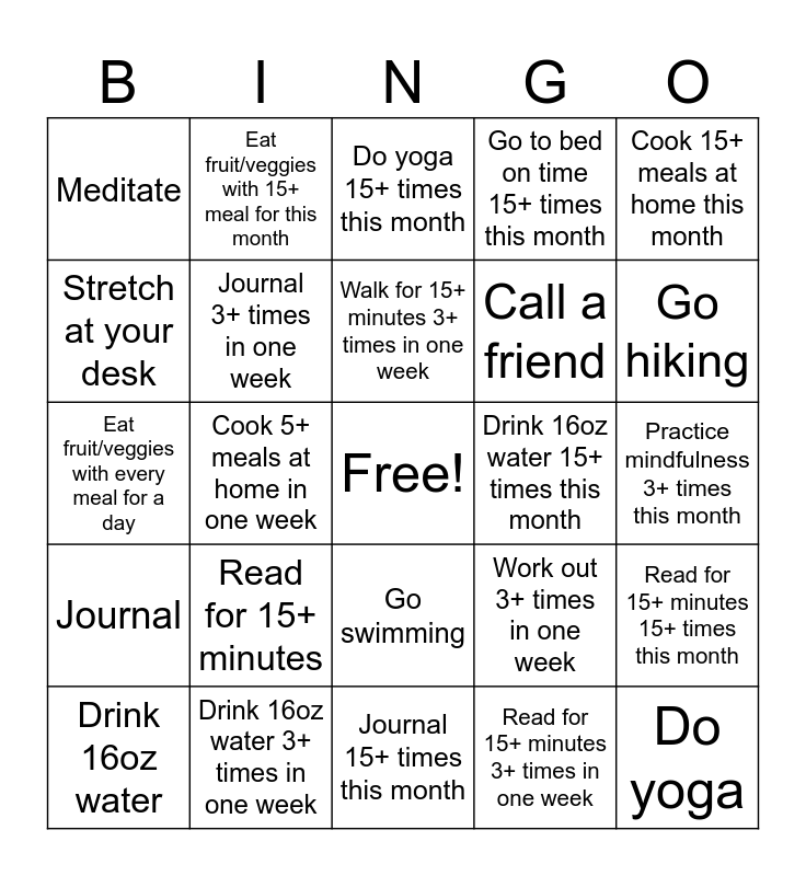 This bingo card has a free space and 42 words: Walk for 60 minutes, Walk for 15+ minutes 3+ times in one week, Walk for 15+ minutes 15+ times this month, Read for 15+ minutes, Read for 15+ minutes 3+ times in one week, Read for 15+ minutes 15+ times this month, Do yoga, Do yoga 3+ times in one week, Do yoga 15+ times this month, Go swimming, Practice mindfulness 3+ times this month, Go hiking, Cook 5+ meals at home in one week, Cook 15+ meals at home this month, Work out for 30+ minutes, Work out 3+ times in one week, Work out 15+ times in one month, Eat fruit/veggies with every meal for a day, Eat fruit/veggies with every meal for a week, Eat fruit/veggies with 15+ meal for this month, Stretch at your desk, Stretch at your desk 3+ times in one week, Stretch at your desk 15+ times this month, Meditate, Meditate 3+ times in one week, Meditate 15+ times this month, Call a friend, Call a friend 10+ times this month, Spend 10+ minutes outside, Spend 10+ minutes outside 3+ times in one week, Spend 10+ minutes outside 15+ times this month, Journal, Journal 3+ times in one week, Journal 15+ times this month, Attend an appointment, Drink 16oz water, Drink 16oz water 3+ times in one week, Drink 16oz water 15+ times this month, Go to bed on time, Go to bed on time 3+ times in one week, Go to bed on time 15+ times this month and Listen to a mental health podcast.