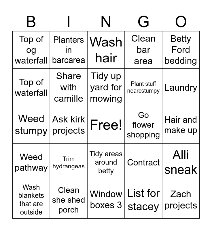 This bingo card has a free space and 24 words: Trim hydrangeas, Clean she shed porch, Tidy up yard for mowing, Wash blankets that are outside, Betty Ford bedding, Top of og waterfall, Top of waterfall, Planters in barcarea, Go flower shopping, Tidy areas around betty, Plant stuff nearcstumpy, Weed stumpy, Contract, Alli sneak, Share with camille, List for stacey, Hair and make up, Wash hair, Laundry, Ask kirk projects, Zach projects, Weed pathway, Clean bar area and Window boxes 3.