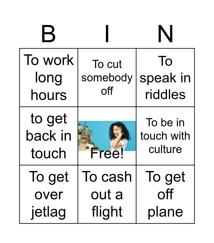 This bingo card has a free space and 24 words: Finding one’s feet, To settle down, To cash out a flight, Something still works for someone, To get off plane, To work long hours, To be in touch with culture, To cut somebody off, Pace of life, To take pride in something, To get picked up at a location, To get a straight answer out of somebody, To be miles better than something, Mouth hanging open, To get over jetlag, To sort out an apartment, To take someone out to lunch, To speak in riddles, To have a moan about things, To share frustrations, To be annoyed with somebody, To be over somewhere, to get back in touch and There’s a lot to be said for something.