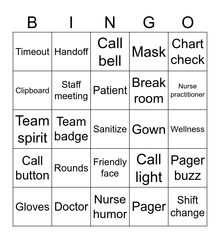 This bingo card has 76 words: Free!, Rounds list, Call bell, Oxygen, Scope, Vitals, Pain scale, Temperature, Coffee, Bed alarm, Shift change, Scrubs, Patient, Clipboard, PPE, Team badge, ECG, Sanitize, Precept, Chart check, Bedside manner, Team spirit, Staff meeting, Handoff, Mask, Discharge, Charting, Nurse Life, Admit, Unit clerk, Syringe, Scrub cap, Flu shot, Call light, Nurse practitioner, Break room, Rapid response, Pen light, Wellness, Pager, Lunch break, Restroom break, Code cart, Waiting room, Chart audit, Glucose, Gloves, Timeout, Chart, Mask fit, Shift report, Friendly face, Stethoscope, Hand-off sheet, Triage board, Compression socks, IV, Discharge papers, Empathy, Hand hygiene, Rounds, Badge, Smiling, Teamwork, Caffeine, Whiteboard, Gown, NPO, Med pass, Admission, Pager buzz, Call button, Doctor, Safety check, Nurse humor and On call.
