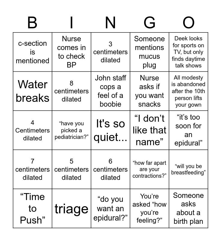 This bingo card has a free space and 24 words: 5 centimeters dilated, triage, John staff cops a feel of a boobie, “Time to Push”, Deek looks for sports on TV, but only finds daytime talk shows, c-section is mentioned, Water breaks, Nurse comes in to check BP, “I don’t like that name”, 6 centimeters dilated, Nurse asks if you want snacks, 4 Centimeters dilated, “how far apart are your contractions?”, “will you be breastfeeding”, 8 centimeters dilated, You’re asked “how you’re feeling?”, “it’s too soon for an epidural”, 3 centimeters dilated, All modesty is abandoned after the 10th person lifts your gown, “have you picked a pediatrician?”, Someone asks about a birth plan, 7 centimeters dilated, Someone mentions mucus plug and “do you want an epidural?”.