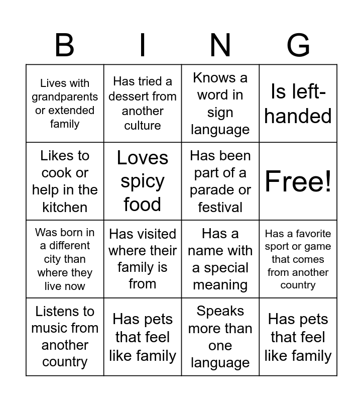 This bingo card has 17 words: Speaks more than one language, Listens to music from another country, Knows a word in sign language, Lives with grandparents or extended family, Has visited where their family is from, Is left-handed, Has a favorite sport or game that comes from another country, Has been part of a parade or festival, Free!, Loves spicy food, Has pets that feel like family, Has a name with a special meaning, Likes to cook or help in the kitchen, Has tried a dessert from another culture, Was born in a different city than where they live now, Has a favorite fruit that grows in another country and Has pets that feel like family.