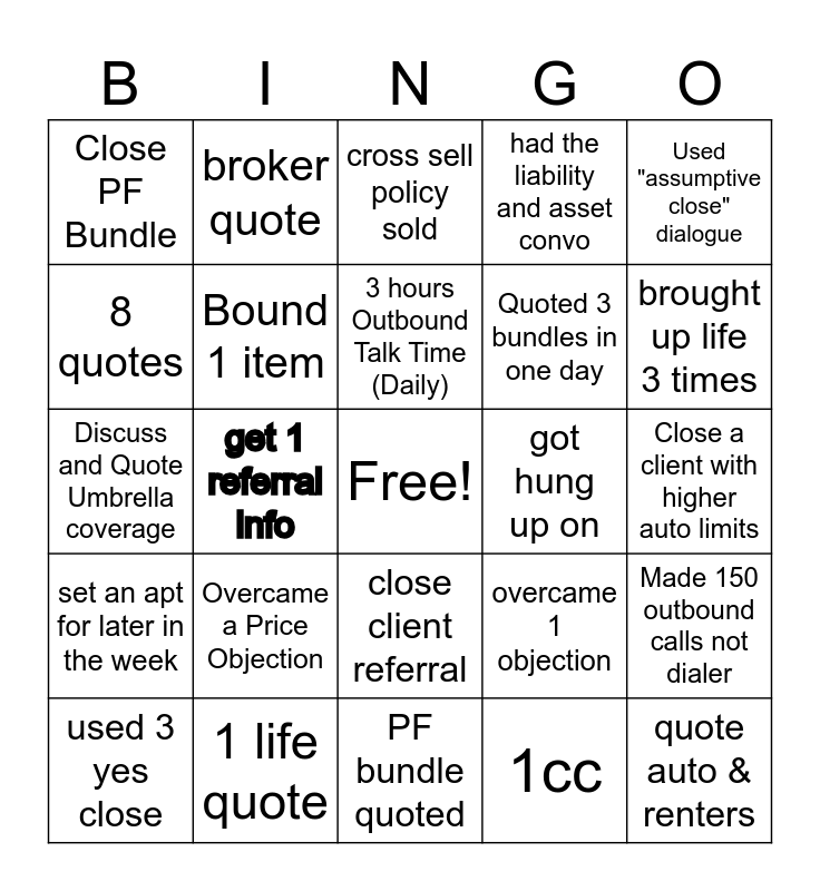 This bingo card has a free space and 24 words: Overcame a Price Objection, 1 life quote, 3 hours Outbound Talk Time (Daily), used 3 yes close, Used "assumptive close" dialogue, Close PF Bundle, 8 quotes, broker quote, got hung up on, close client referral, Quoted 3 bundles in one day, Discuss and Quote Umbrella coverage, overcame 1 objection, Made 150 outbound calls not dialer, Bound 1 item, 1cc, Close a client with higher auto limits, cross sell policy sold, brought up life 3 times, get 1 referral info, quote auto & renters, set an apt for later in the week, had the liability and asset convo and PF bundle quoted.