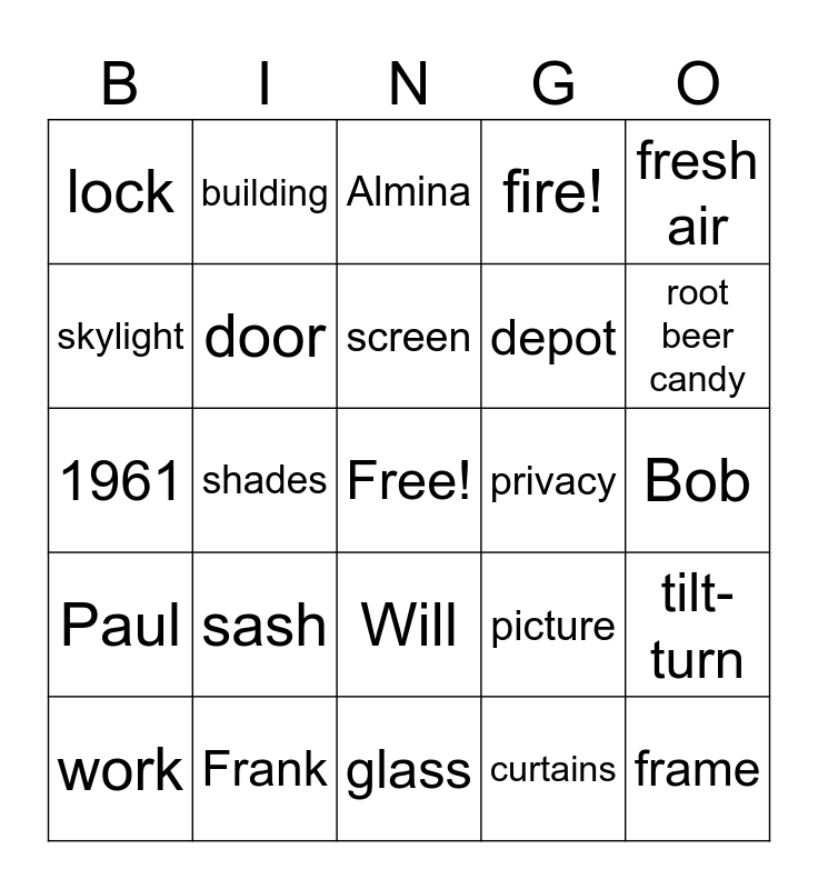 This bingo card has a free space and 52 words: window, frame, wood, glass, sash, latch, building, house, skylight, modern, door, double-hung, tilt-turn, picture, casement, round top, screen, privacy, view, fresh air, shades, curtains, lock, depot, grain elevator, logging, tools, hardware, root beer candy, marbles, nickels, fire!, teacher, George, Bill, Almina, Frank, Jack, Tut, Cal, Susan, Bob, Paul, Dan, Will, Christine, 1904, 1961, truck, history, work and sale.
